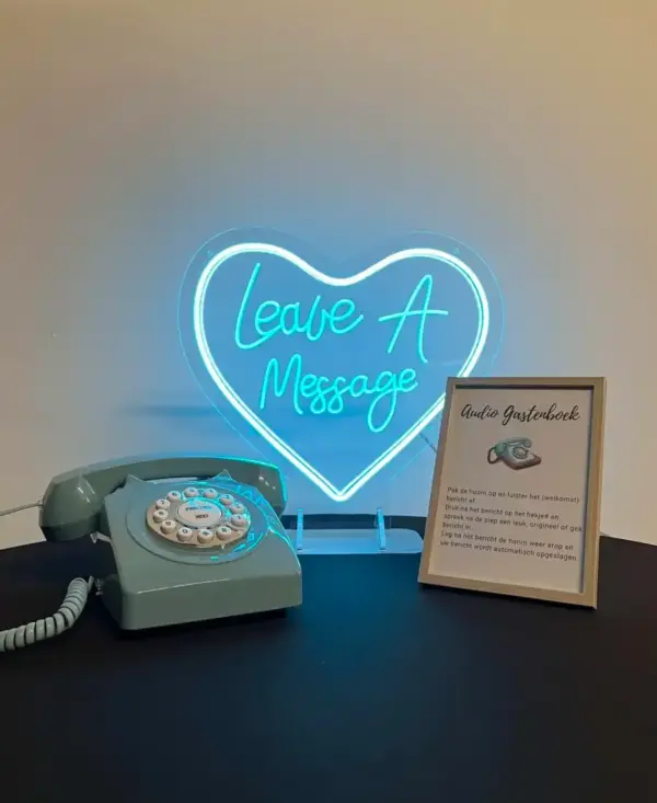 Deze audio gastenboek telefoon wordt geleverd met een neon sign en uitleg telefoon. Zie foto.