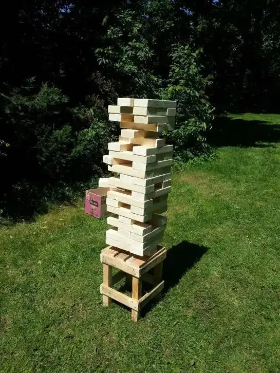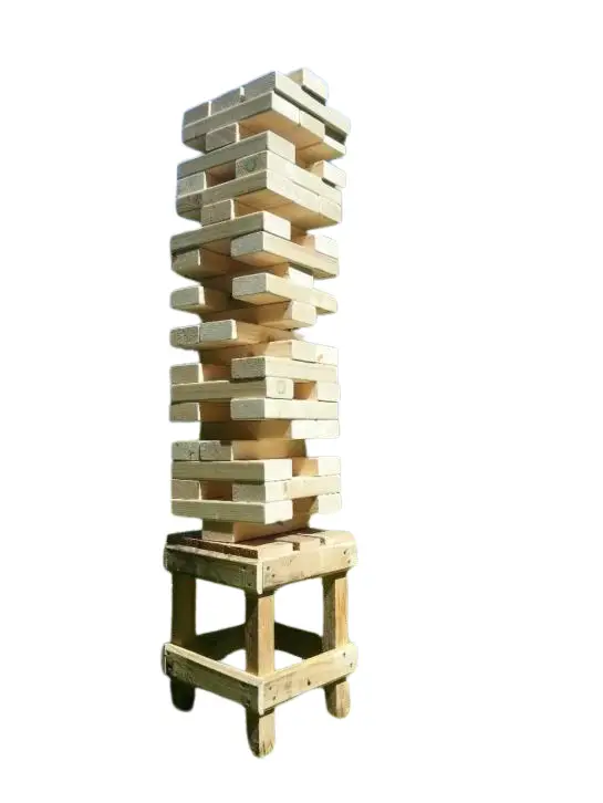 Een grote uitvoering van het welbekende gezelligheidsspel. Dit spel is door twee spelers of door twee teams tegen elkaar te spelen. Om en om pakken de twee spelers of twee teams een balk uit de stapel en plaatsen deze weer bovenop de stapel. Is een team geweest en blijft de scoren tien seconden staan, dan is de volgende aan de beurt. Net zolang tot de toren valt. Dit reuze Jenga spel staat garant voor urenlang speelplezier tijdens bijvoorbeeld een barbecue of kinderfeestje.