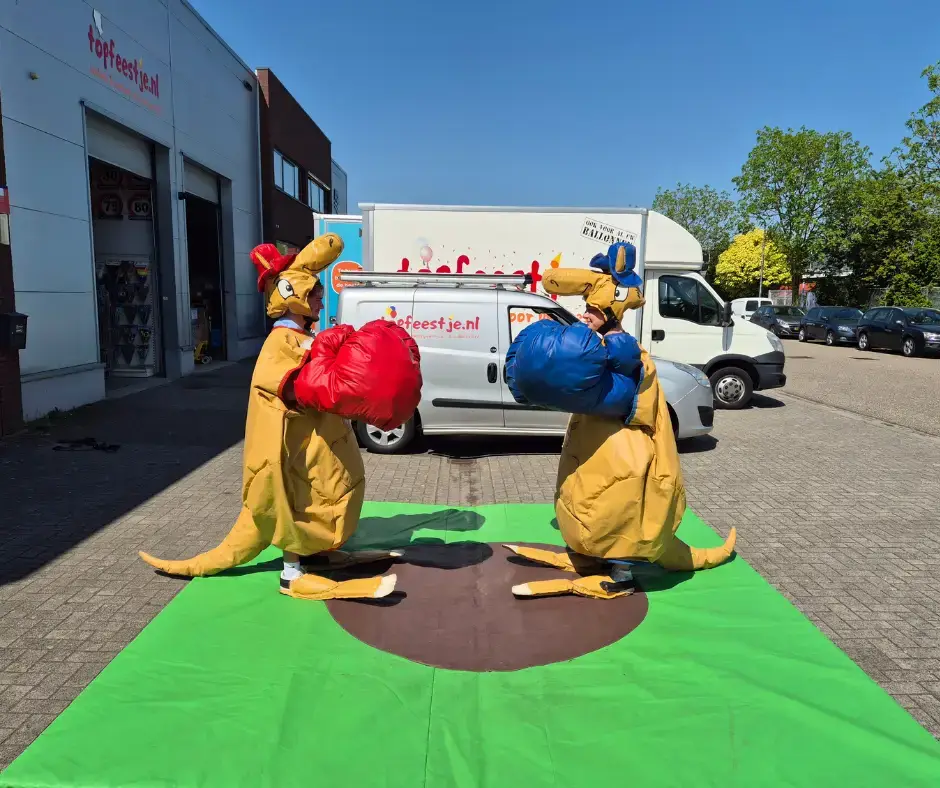 Kangoeroe boksen is een zeer fantastisch “strijd” spel dat door ieder volwassene gespeeld kan worden. Elke speler trekt een kangoeroe pak aan waarna de 2 spelers tegen elkaar gaan boksen met enorme bokshandschoenen. Wie zal de ander K.O. slaan? Geleverd met 2 kangoeroepakken, 4 handschoenen, 2 kangoeroe helmen, 2 kangoeroe voeten en een mat.