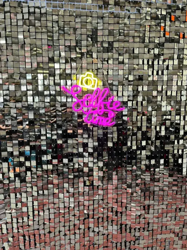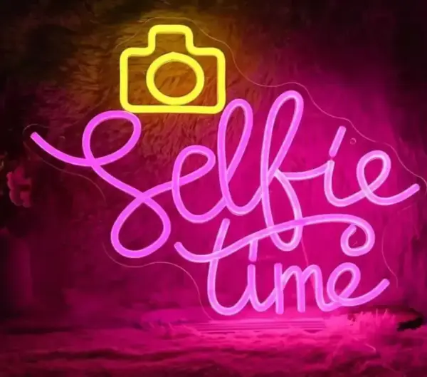 Geen topfeestje is compleet zonder deze selfie time neon lamp. Leuk bij bijvoorbeeld een shimmerwall, of flowerwall. Breed 38 cm Hoog 29 cm